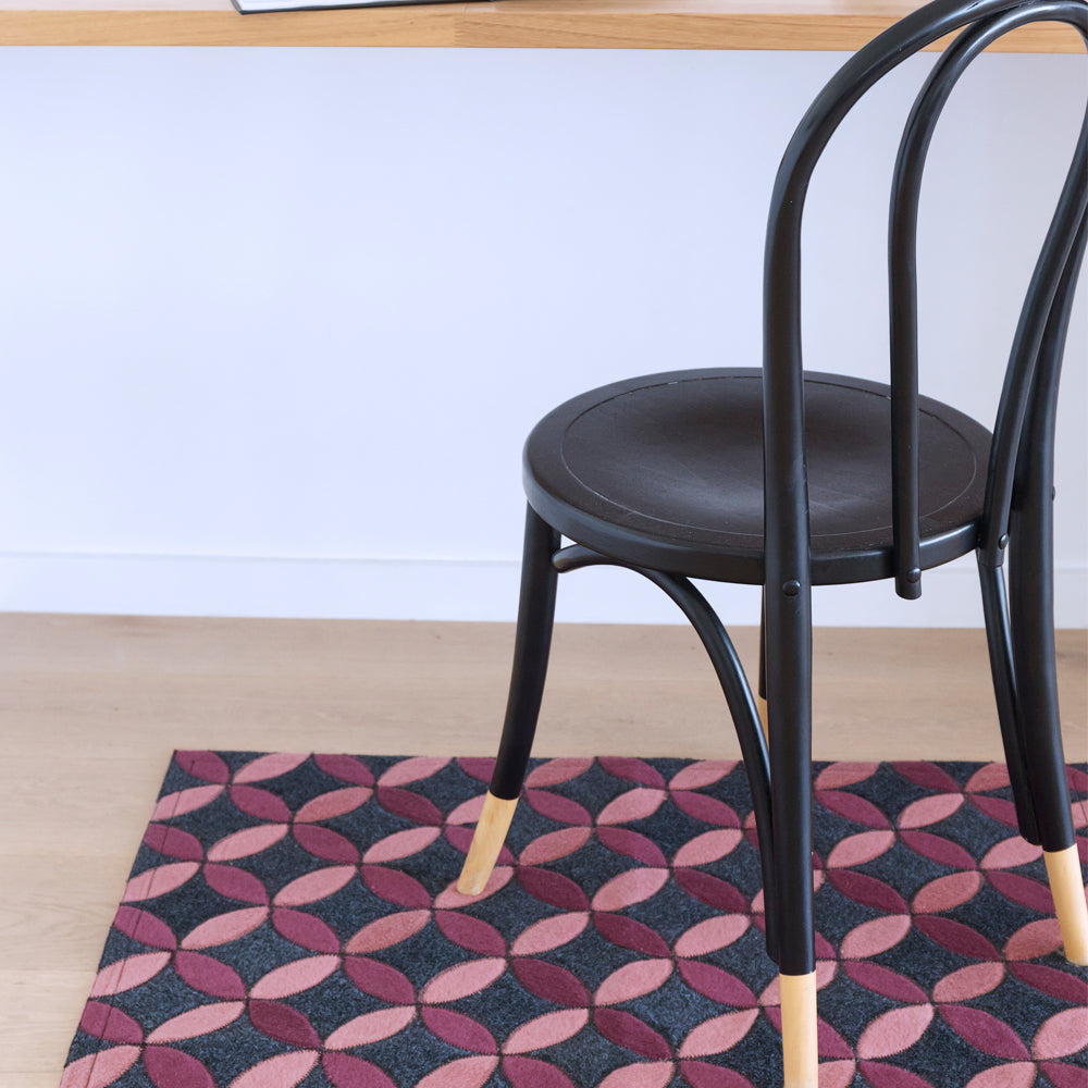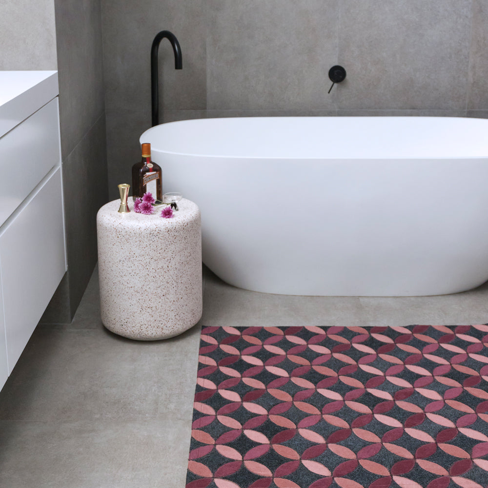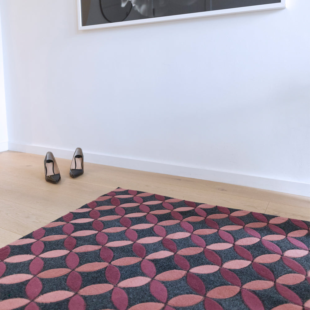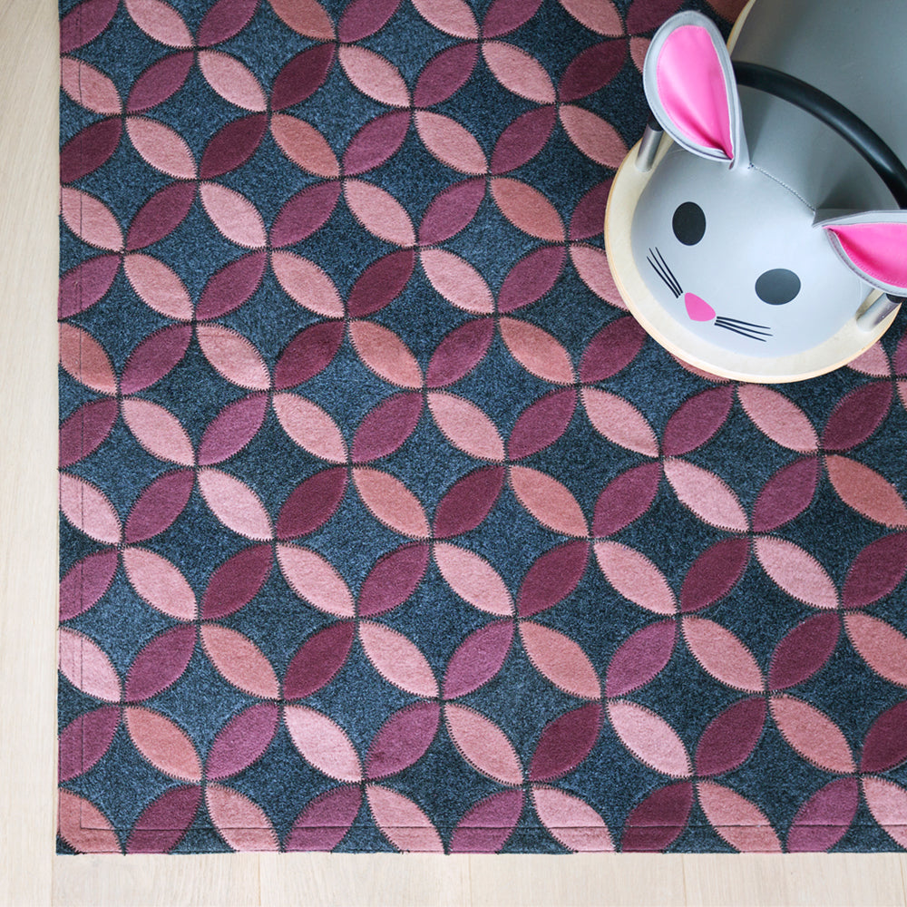 With bright jewel tones and a petal shaped trailing pattern on a marled charcoal base, the Aladdin is a fun, yet sophisticated rug for any setting.